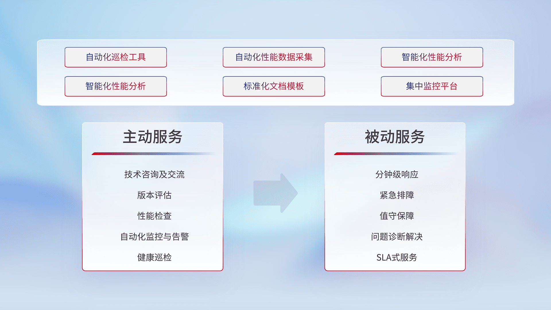 智能化工具和标准化文档,,,,保障服务质量,,提供主动服务(包含技术咨询、、版本评估、、、、性能检查、、自动化监控与告警、、健康巡检)和被动服务包含(分钟级响应、、紧急排障、、、值守保障、、、问题诊断解决、、、、SLA服务)。。。。